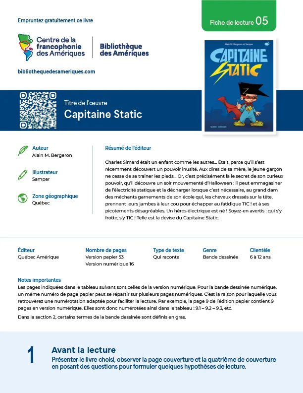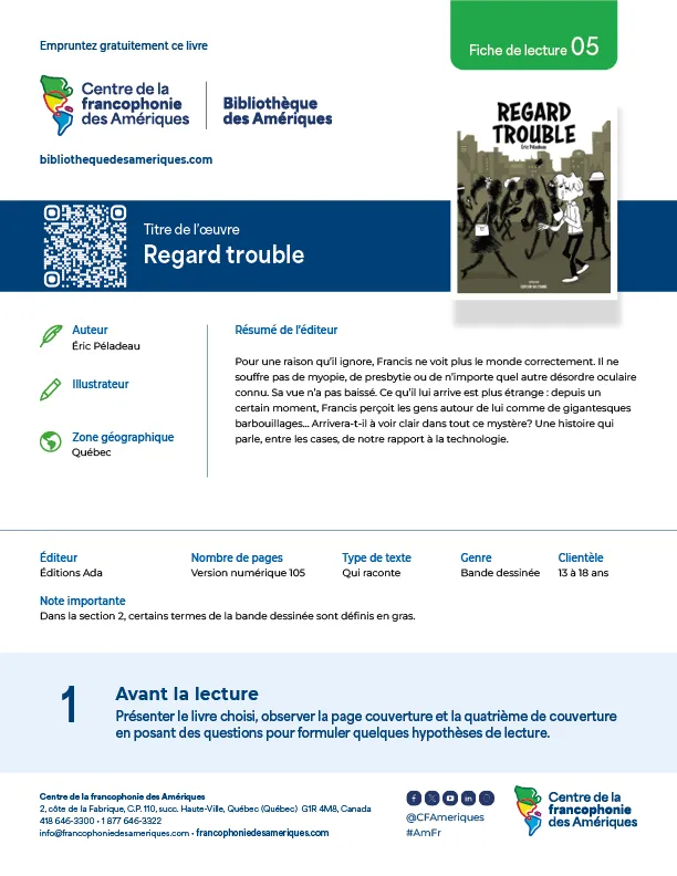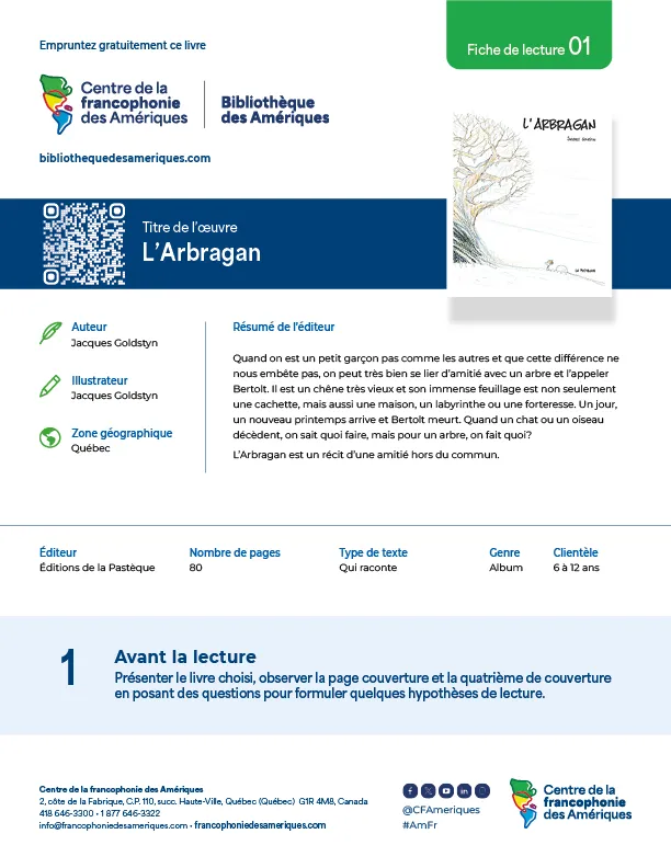 Une sélection d’œuvres provenant de différentes zones géographiques des Amériques est proposée aux enseignants en plus de suggérer une variété de types de textes. Ces fiches de lecture visent le développement des compétences écrites et orales en français d’élèves de 6 à 18 ans.