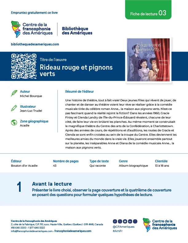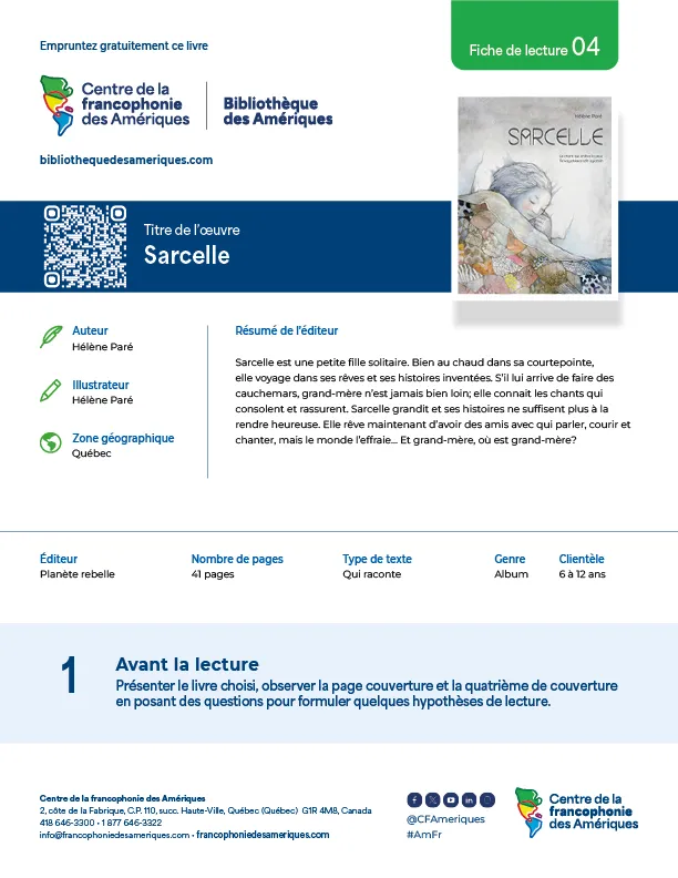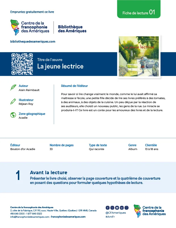 La Bibliothèque des Amériques propose aux enseignants des fiches de lecture en trois étapes qui permettent d’offrir une démarche d’apprentissage stimulante avant la lecture, pendant la lecture et après la lecture.