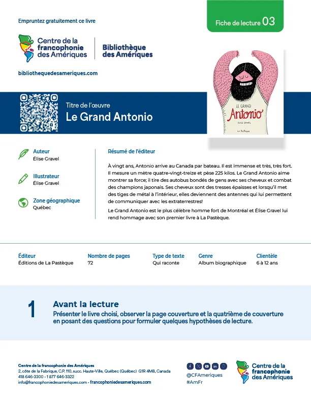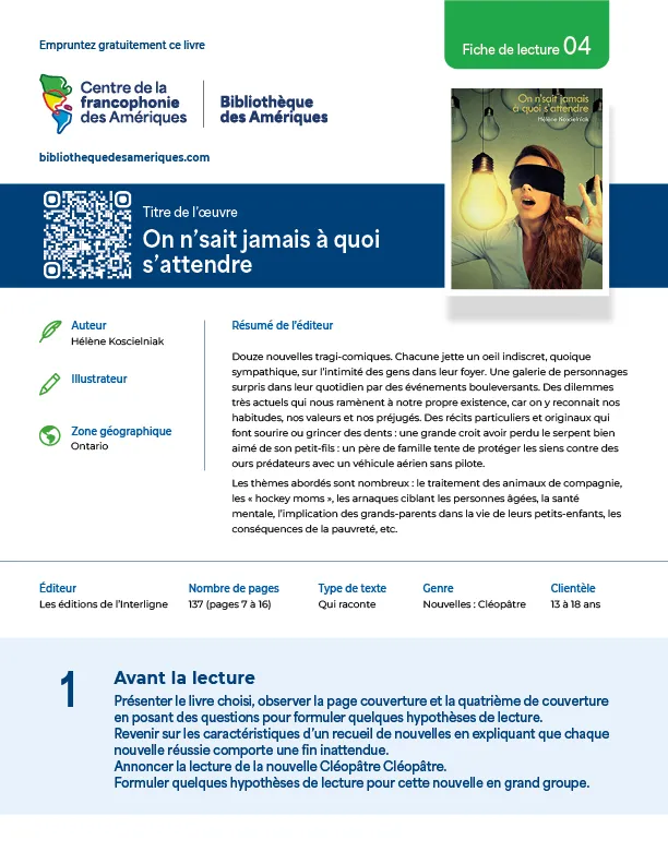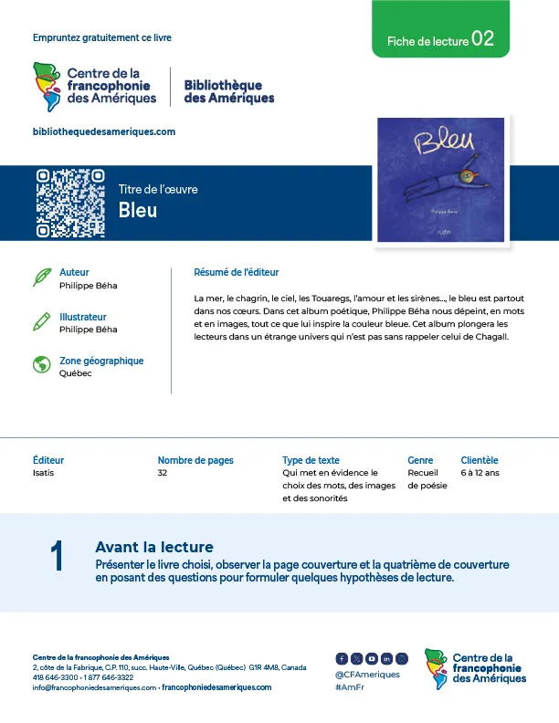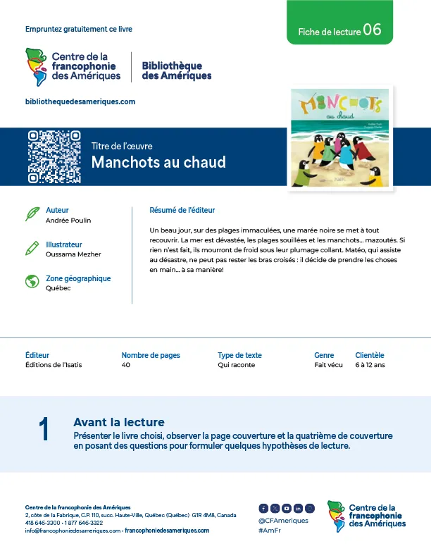 Une sélection d’œuvres provenant de différentes zones géographiques des Amériques est proposée aux enseignants en plus de suggérer une variété de types de textes. Ces fiches de lecture visent le développement des compétences écrites et orales en français d’élèves de 6 à 18 ans.