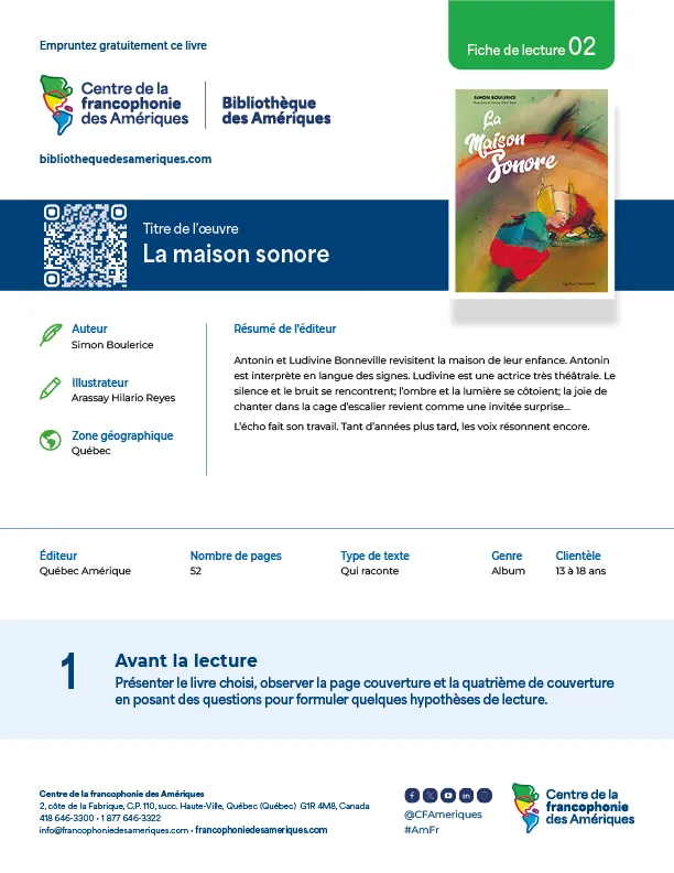 La Bibliothèque des Amériques propose aux enseignants des fiches de lecture en trois étapes qui permettent d’offrir une démarche d’apprentissage stimulante avant la lecture, pendant la lecture et après la lecture.